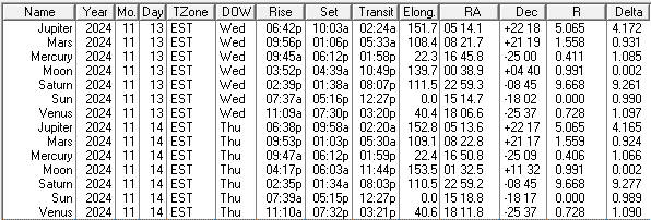 This is a low precision ephemeris of the Sun Moon and naked eye planet positions for today and tomorrow, November 13 and 14, 2024. Some of the columns are self-explanatory, others not. The transit column is the time that the body crosses the meridian and is due south. Elong, for elongation, is the angle between the Sun and that body. RA is right ascension, which is the object’s east-west position on the celestial sphere in hours and minutes. Dec is declination which is the north-south position of the object on the celestial sphere in degrees and minutes. R is the distance of that object from the Sun in astronomical units. An astronomical unit is about 93 million miles or 150 million kilometers. And Delta is the distance of that object from the Earth, also in astronomical units. I omit the ‘m’ in am and pm for compactness. The data was generated using my LookingUp for DOS app and displayed as a table by my Ephemeris Helper app.