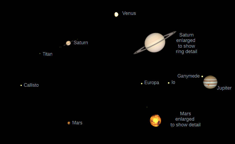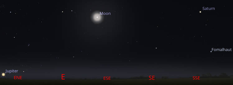 Saturn, the Moon with Jupiter rising at 7 PM. Off to the right beyond the image, Venus setting in the southwest. Click or tap on the image to enlarge it. Created using Stellarium.
