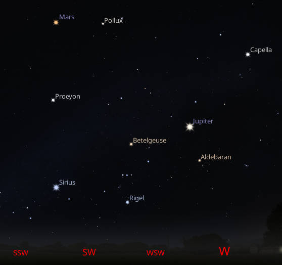 Jupiter and Mars among the stars of winter seen in the southwestern sky at 6 AM, or about an hour and a half before sunrise, tomorrow morning November 14, 2024. Created using Stellarium.