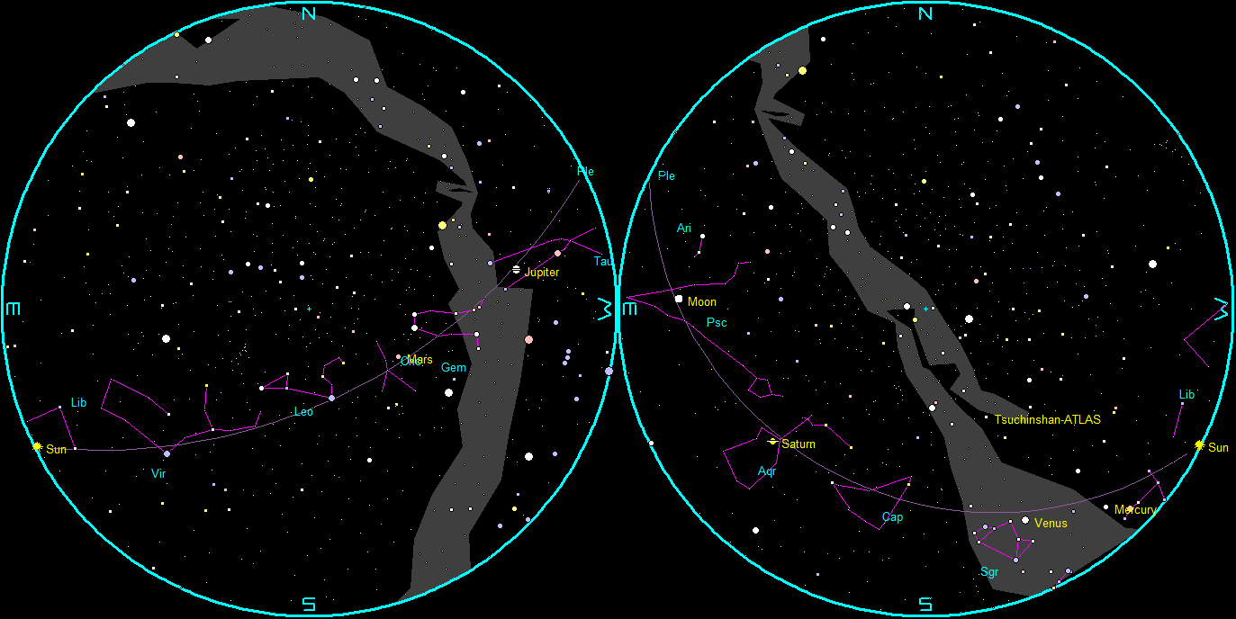 The naked-eye planets and the Moon at sunset and sunrise on a single night, starting with sunset on the right on November 13, 2024. The night ends on the left with sunrise on the 14th. Click or tap on the image to enlarge it. Created using my LookingUp app and GIMP.