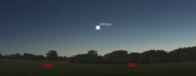 Venus as it might appear tonight at 6 PM, about 45 minutes after sunset, low in the southwest. Venus is now as far South in the sky as it will get and will now begin to move northward. From now until the end of the year it will rise higher and higher in the sky in the evening. Its greatest eastern separation, or elongation, from the Sun will occur on January 2nd. Created using Stellarium.