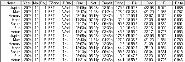 This is a low precision ephemeris of the Sun Moon and naked eye planet positions for today and tomorrow, December 4 and 5, 2024. Some of the columns are self-explanatory, others not. The transit column is the time that the body crosses the meridian and is due south. Elong, for elongation, is the angle between the Sun and that body. RA is right ascension, which is the object’s east-west position on the celestial sphere in hours and minutes. Dec is declination which is the north-south position of the object on the celestial sphere in degrees and minutes. R is the distance of that object from the Sun in astronomical units. An astronomical unit is about 93 million miles or 150 million kilometers. And Delta is the distance of that object from the Earth, also in astronomical units. I omit the ‘m’ in am and pm for compactness. The data was generated using my LookingUp for DOS app and displayed as a table by my Ephemeris Helper app.