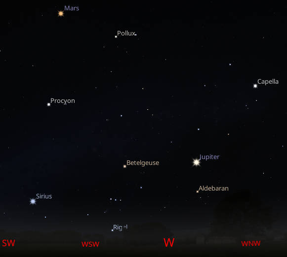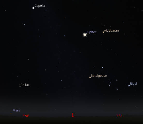 Jupiter with Mars rising in the east at 9:00 PM with Orion also rising. Created using Stellarium.