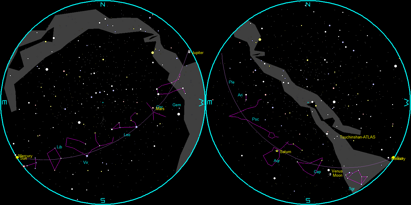 Let’s take our weekly look at the whereabouts of the naked-eye planets. Venus can be spotted low in the south-southwestern sky by 5:30 PM, about 30 minutes after sunset. It appears above the Moon tonight, and will set at 8:09 PM. Saturn will be in the south-southeast at 6 PM. Jupiter will rise at 5:09 PM in the east-northeast, and be a good object for the small telescope about an hour later. Mars, rises tonight at 8:47, Both Mars and Jupiter are considered morning planets, since they are still up at sunrise, though Jupiter will be an evening planet after Saturday. By 6:00 AM tomorrow Jupiter will be in the west, above and right of Orion, while reddish Mars will be high in the southwest. Jupiter and Saturn are great planets to view with a small telescope.