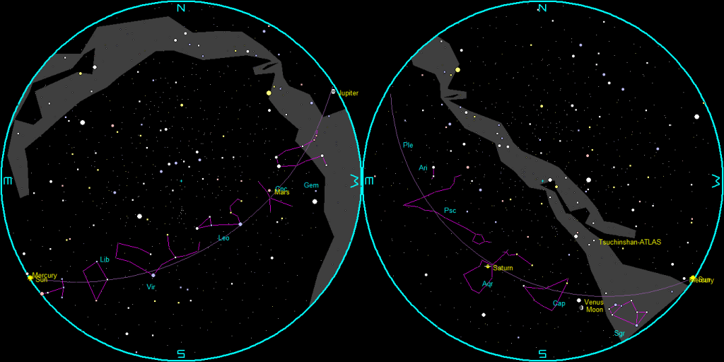The naked-eye planets and the Moon at sunset and sunrise on a single night, starting with sunset on the right on December 4, 2024. The night ends on the left with sunrise on the 5th. Click or tap on the image to enlarge it. Created using my LookingUp app and GIMP.
