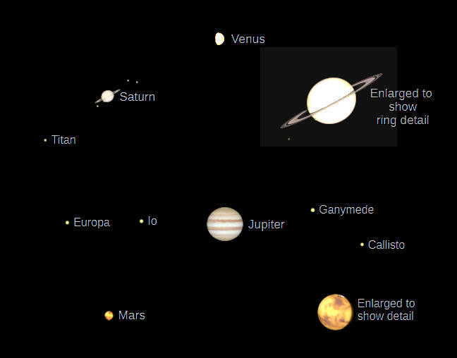 Telescopic Venus, Saturn, Jupiter and Mars (north up) as they would be seen in a small telescope with the same magnification. All the planets are shown for tonight, Jupiter specifically for 8 PM, December 4, 2024. Apparent diameters: Venus 17.6″, 66.4% illuminated; Saturn 17.3″, its rings 40.3″, 5.1 degrees from edge on (closing again); Jupiter 48.2″; Mars, 12.0″, 93.5% illuminated. Saturn’s rings are actually much brighter than depicted here. Planetary surface detail is more subtle than shown here. The ” means seconds of arc, or 1/3600th of a degree. Click or tap on the image to enlarge it. Created using Cartes du Ciel (Sky Charts).