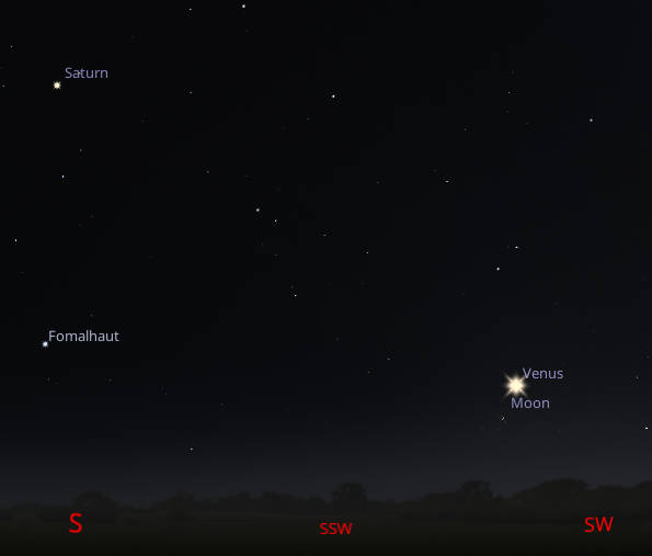 Venus and Saturn as they would appear about 6:30 this evening. The Moon is lost in the bloated image of Venus. Created using Stellarium.