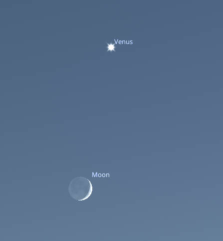 Venus will appear above the waxing crescent moon this evening. This is their separation at 5:30 PM from Northern Michigan. The Moon will be moving to the upper left compared to Venus. Created using Stellarium.