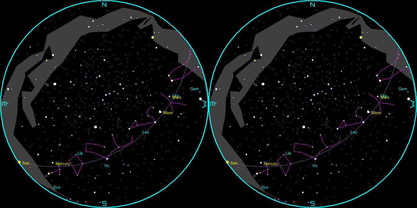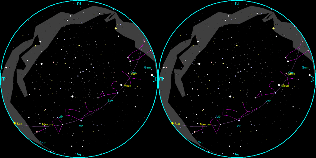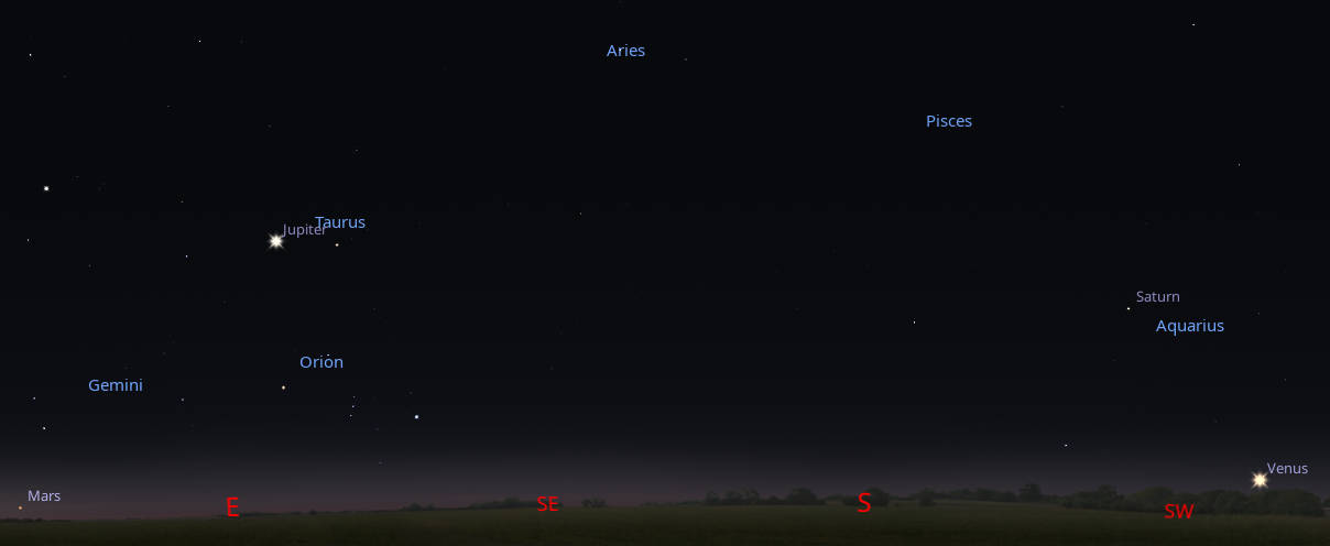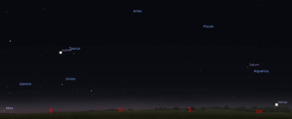 This is what I call my 8:00 PM planet panorama. Venus is setting the southwest Saturn heading downwards in the southwest, Jupiter high in the east and Mars just rising in the east northeast. The waning gibbous Moon will rise shortly, trailing Mars. The only thing we’re really missing is Mercury which is close to the Sun in the morning sky. Click or tap on the image to enlarge it. Created using Stellarium.
