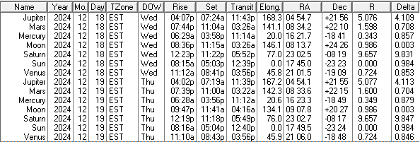 This is a low precision ephemeris of the Sun Moon and naked eye planet positions for today and tomorrow, December 18 and 19, 2024. Some of the columns are self-explanatory, others not. The transit column is the time that the body crosses the meridian and is due south. Elong, for elongation, is the angle between the Sun and that body. RA is right ascension, which is the object’s east-west position on the celestial sphere in hours and minutes. Dec is declination which is the north-south position of the object on the celestial sphere in degrees and minutes. R is the distance of that object from the Sun in astronomical units. An astronomical unit is about 93 million miles or 150 million kilometers. And Delta is the distance of that object from the Earth, also in astronomical units. I omit the ‘m’ in am and pm for compactness. The data was generated using my LookingUp for DOS app and displayed as a table by my Ephemeris Helper app.