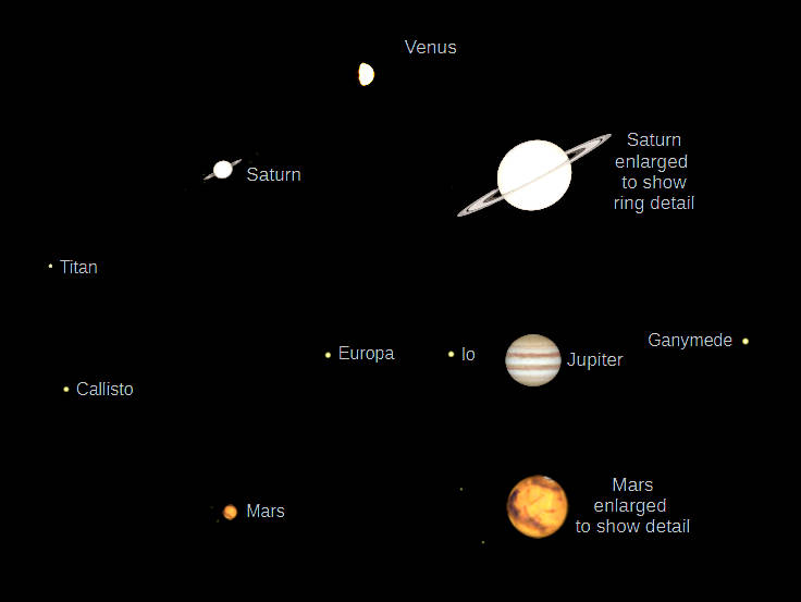 Telescopic Venus, Saturn, Jupiter and Mars (north up) as they would be seen in a small telescope with the same magnification. All the planets are shown for tonight, Jupiter specifically for 9 PM, December 18, 2024. Apparent diameters: Venus 19.7″, 61.1% illuminated; Saturn 16.9″, its rings 39.4″, 4.7 degrees from edge on (closing); Jupiter 47.9″; Mars, 13.3″, 96.3% illuminated. Saturn’s rings are actually much brighter than depicted here. Planetary surface detail is more subtle than shown here. The ” means seconds of arc, or 1/3600th of a degree. Click or tap on the image to enlarge it. Created using Cartes du Ciel (Sky Charts).