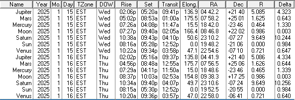 Ephemeris: 01/15/2025 – Our weekly look at the whereabouts of the naked-eye planets