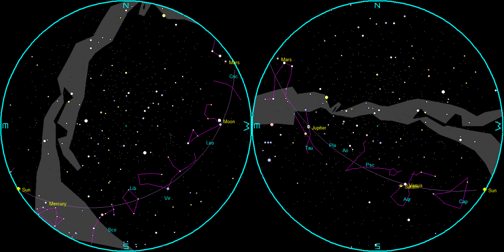 Tonight, Venus will be at its greatest separation from the Sun in the sky at a little bit more than a 47° angle. Venus, being inside the Earth’s orbit, can ever stray far from the Sun. So today it is at its greatest eastern elongation from the Sun. For the rest of winter it will be moving closer to the Sun from our perspective. Crossing between the Earth and the Sun on March 22nd. During this period of time Venus will be a great object for the telescope, as it moves closer to the Earth and gets larger in telescopes and its phase, moving from being like a quarter moon to a very thin crescent near the end of winter. At inferior conjunction with the Sun, Venus will be only 26 million miles away from us, but quite invisible in the Sun’s glare.