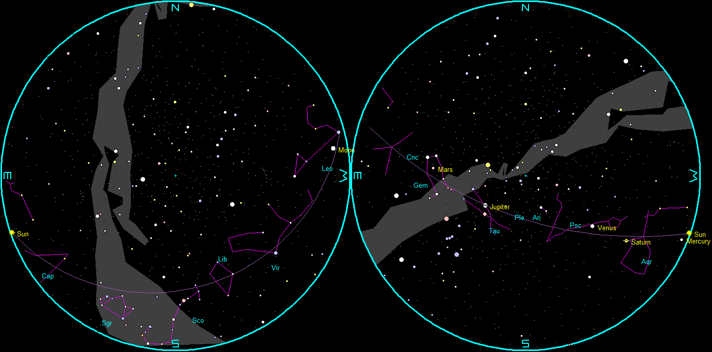 The naked-eye planets and the Moon at sunset and sunrise on a single night, starting with sunset on the right on February 12, 2025. The night ends on the left with sunrise on the 13th. Click or tap on the image to enlarge it. Created using my LookingUp app and GIMP.