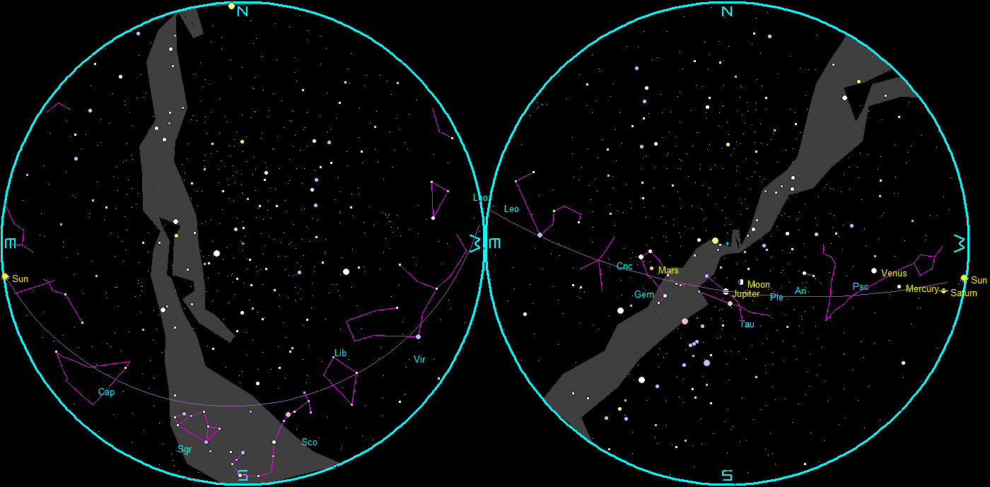 Let’s take our weekly look at the whereabouts of the naked-eye planets. At 7:10 PM this evening four of the five naked eye planets will be out. Starting from the West we have Venus the brightest of all. Below it at the 7 o’clock position and halfway to the horizon is the much dimmer Mercury, three days from its greatest separation from the Sun. Jupiter, the second-brightest planet will be high in the south-southwest below and right of the Moon tonight. The 4th planet out is Mars, the third-brightest planet now, with its distinctive reddish hue, west of the stars Castor and Pollux in Gemini, and in the southeast. By the end of the month both Venus and Mercury will be gone out of the evening sky, leaving only two, Mars and Jupiter.