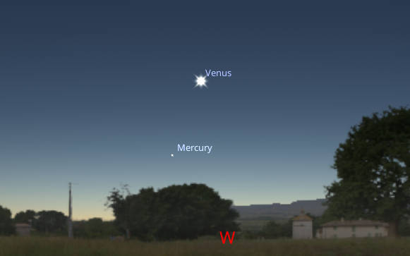 Venus and Mercury seen low in the west at 7:10 PM this evening, March 5th 2025. Created using Stellarium.