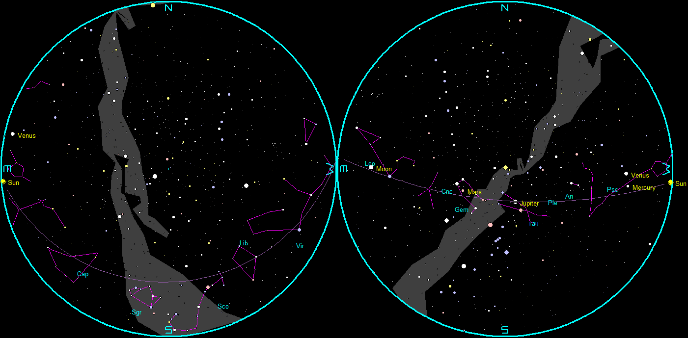 Let’s take our weekly look at the whereabouts of the naked-eye planets. At 8:30 PM this evening four of the five naked eye planets will be out. Starting from the West we have Venus the brightest of all. Left and a bit below is the much dimmer Mercury. Both will rapidly disappear in evening twilight in a less than a week. Venus will pass in conjunction with the Sun on March 22nd, Mercury will do the same two days later. Jupiter, the second-brightest planet will be high in the southwest. Mars, the third-brightest planet now, with its distinctive reddish hue, is high in the south-southeast, below and right of the stars Castor and Pollux in Gemini. By the end of the month only two planets, Mars and Jupiter will be left in the evening sky.