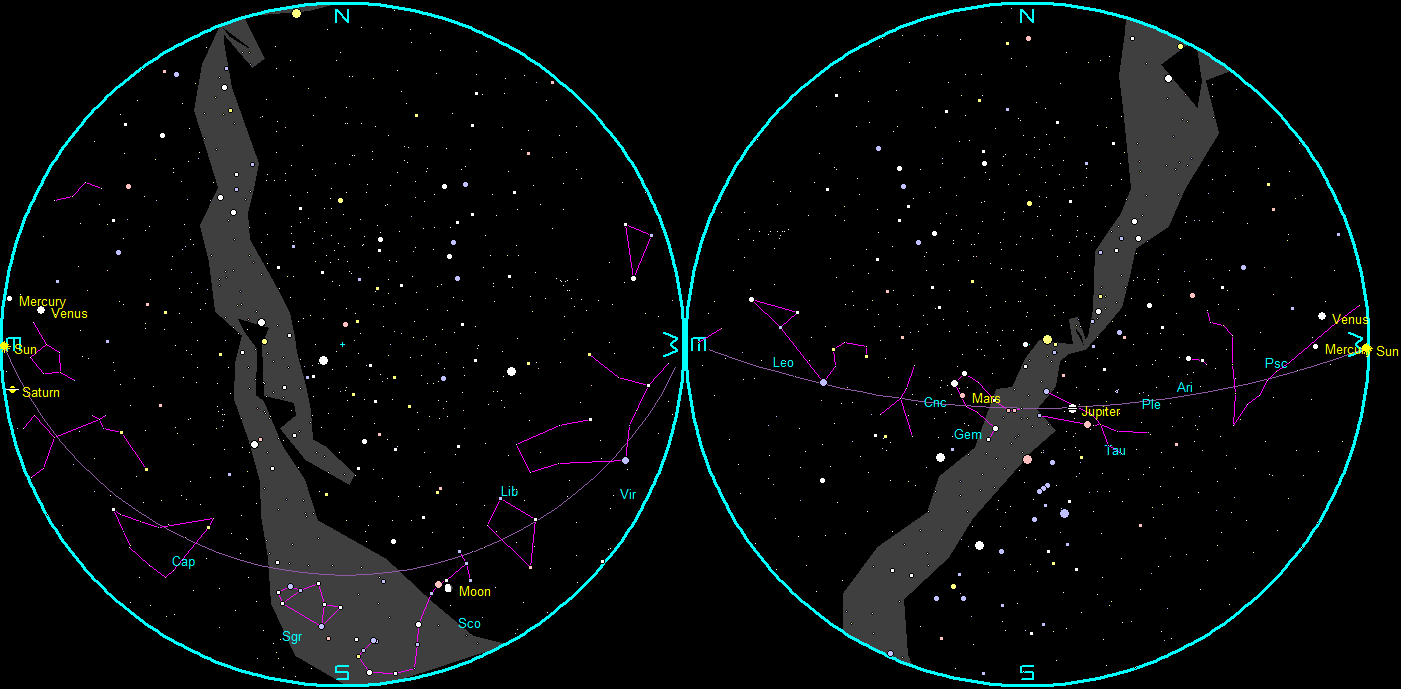 Let’s take our weekly look at the whereabouts of the naked-eye planets. At 9 PM this evening just two of the five naked eye planets will be out. Venus and Mercury are too close to the Sun in the twilight to be seen. Saturday and Monday Venus and then Mercury will pass between the Earth and the Sun to enter the morning sky. Jupiter, now becomes the brightest evening planet. It will be high in the southwest. Below it is the bright star Aldebaran with the stars of the Hyades, the face of Taurus the bull, and to the lower left, the great constellation of Orion, The rapidly fading Mars, with its distinctive reddish hue, is high in the south, with the stars Castor and Pollux in Gemini above it.