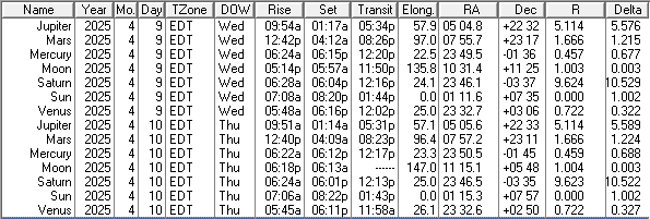 This is a low precision ephemeris of the Sun Moon and naked eye planet positions for today and tomorrow, April 9th and 10th, 2025. Some of the columns are self-explanatory, others are not. The transit column is the time that the body crosses the meridian and is due south. Elong, for elongation, is the angle between the Sun and that body. RA is right ascension, which is the object’s east-west position on the celestial sphere in hours and minutes. Dec is declination which is the north-south position of the object on the celestial sphere in degrees and minutes. R is the distance of that object from the Sun in astronomical units. An astronomical unit is about 93 million miles or 150 million kilometers. And Delta is the distance of that object from the Earth, also in astronomical units. I omit the ‘m’ in am and pm for compactness. The data was generated using my LookingUp for DOS app and displayed as a table by my Ephemeris Helper app.