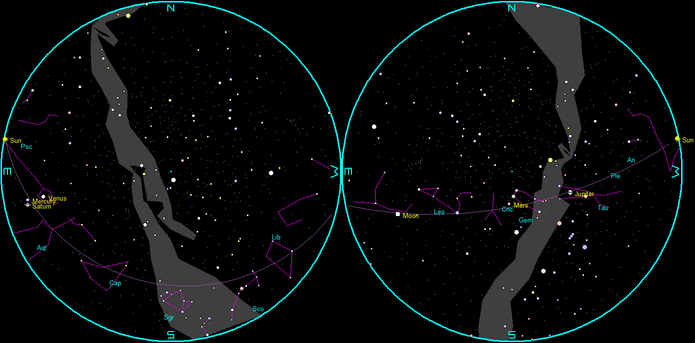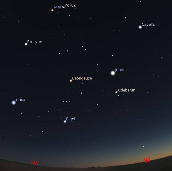 Looking into the west-southwestern sky at 9 pm tonight, Jupiter and Mars are hanging out with the winter stars. And Jupiter, at least, will follow them into the bright twilight in a month or so. Mars will continue its eastward trek from Gemini into Cancer in the next month. Created using Stellarium.