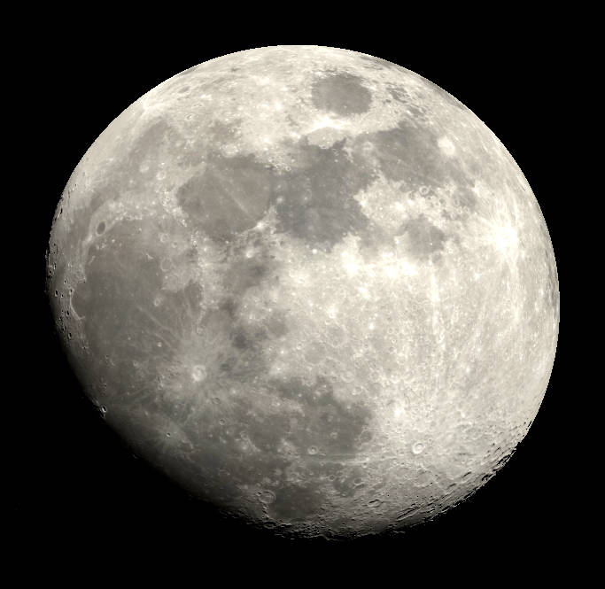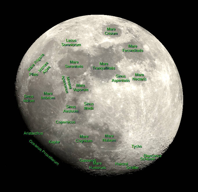 The Moon tonight, 3 days before full. A view visible in small telescopes showing an image with and without selected features labeled. Created using Stellarium, LibreOffice Draw, and GIMP.