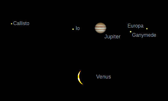 Telescopic Jupiter and Venus (north up) as it would be seen in a small telescope with the same magnification. Jupiter is shown for tonight, 9 PM, April 9, 2025. Its apparent diameter is 35.3″. Mars is 7.7″ in diameter, too small to be shown here. My lower size limit is 10″. Venus is shown in the morning of the 10th. Its apparent diameter is 35.3″, and is 10.8% iluminated. Planetary surface detail is more subtle than shown here. The ” means seconds of arc, or 1/3600th of a degree. Created using Cartes du Ciel (Sky Charts).