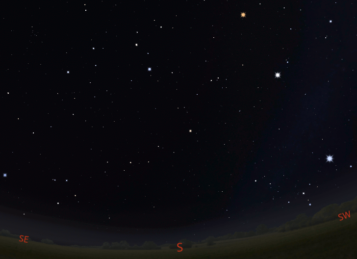 Stretching from midway up the sky in the south-southwest to low in the southeast at 10 p.m. can be found the constellation of Hydra the water snake, the longest constellation of all. Unlike the monster of the same name that Hercules slew, this Hydra has but one head, which is its most distinctive part. The head of Hydra is located between the bright stars Procyon in the southwest, which is above the brighter star Sirius low in the sky, and Regulus in Leo the lion, higher in the south. Hydra’s head is a small but distinctive group of 6 stars that make a drooping loop to the right. The rest of Hydra wends its way in a crooked line from star to star, but within a reasonably straight path down to the southeastern horizon.