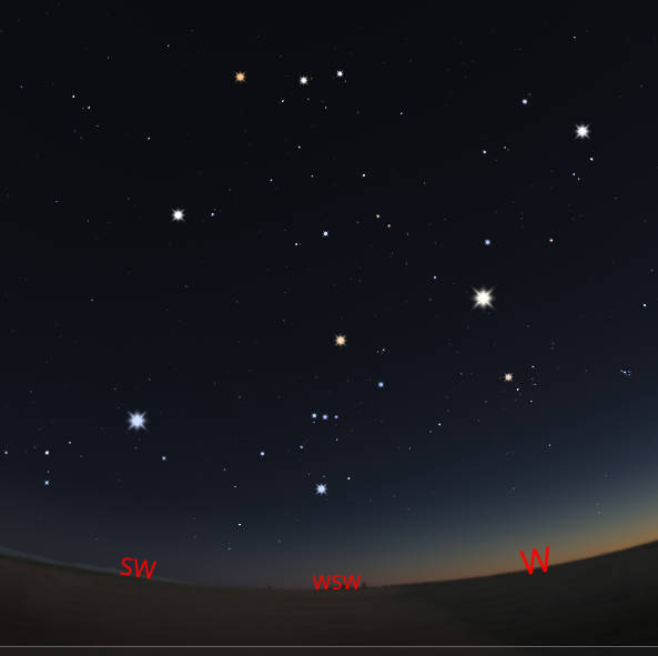 Let’s take our weekly look at the whereabouts of the naked-eye planets. At 9:30 PM this evening just two of the five naked eye planets will be out. Jupiter, now becomes the brightest evening planet, our substitute evening star if you will. It will be high in the west. Below it is the bright star Aldebaran. To its lower left, the great constellation of Orion. The rapidly fading Mars, with its distinctive reddish hue, is high in the south-southwest, with the stars Castor and Pollux in Gemini to the right of it. By 6 AM Venus will be seen very low in the east, as the Morning Star. It will require a low eastern horizon. It should be visible until a bit after 6:30. Saturn should be visible in the morning by the end of the month.