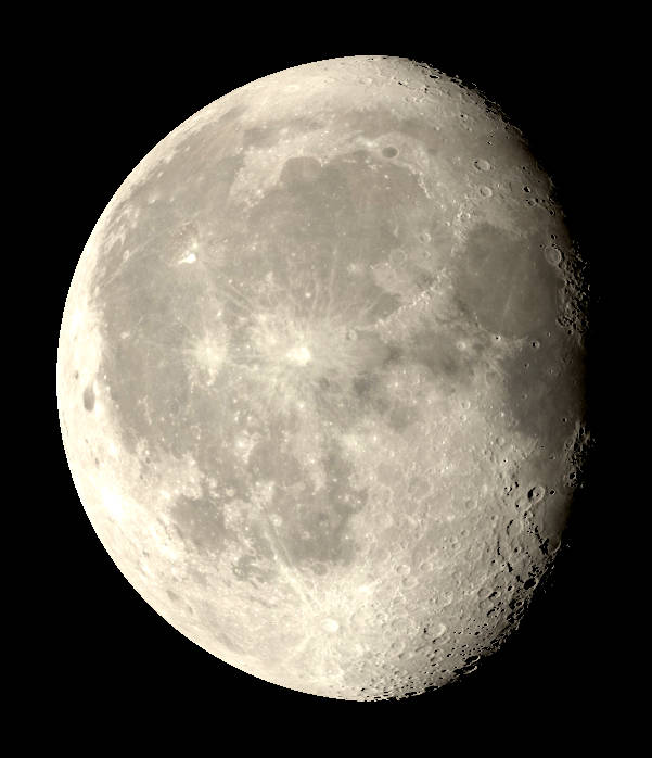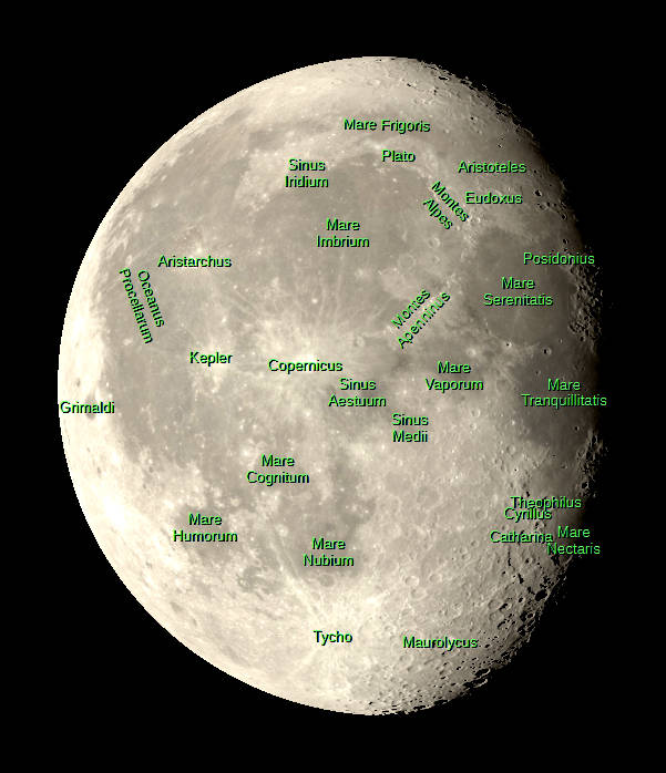 The Moon 6 AM tomorrow morning, April 17, 2025, 2 1/2 days before last quarter. A view visible in small telescopes showing an image with and without selected features labeled. Created using Stellarium, LibreOffice Draw, and GIMP.
