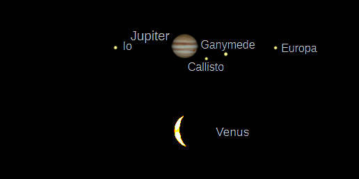 Telescopic Jupiter and Venus (north up) as it would be seen in a small telescope with the same magnification. Jupiter is shown for tonight, 9:30 PM, April 16, 2025. Its apparent diameter is 34.7″. Mars is 7.3″ in diameter, too small to be shown here. My lower size limit is 10″. Venus is shown in the morning of the 17th. Its apparent diameter is 45.5″, and is 17.1% iluminated. Planetary surface detail is more subtle than shown here. The ” means seconds of arc, or 1/3600th of a degree. Created using Cartes du Ciel (Sky