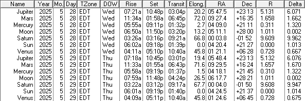 This is a low precision ephemeris of the Sun Moon and naked eye planet positions for today and tomorrow, May 28th and 29th, 2025. Some of the columns are self-explanatory, others are not. The transit column is the time that the body crosses the meridian and is due south. Elong, for elongation, is the angle between the Sun and that body. RA is right ascension, which is the object’s east-west position on the celestial sphere in hours and minutes. Dec is declination which is the north-south position of the object on the celestial sphere in degrees and minutes. R is the distance of that object from the Sun in astronomical units. An astronomical unit is about 93 million miles or 150 million kilometers. And Delta is the distance of that object from the Earth, also in astronomical units. I omit the ‘m’ in am and pm for compactness. The data was generated using my LookingUp for DOS app and displayed as a table by my Ephemeris Helper app.
