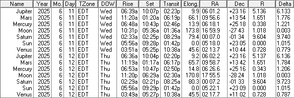 This is a low precision ephemeris of the Sun Moon and naked eye planet positions for today and tomorrow, June 11th and 12th, 2025. Some of the columns are self-explanatory, others are not. The transit column is the time that the body crosses the meridian and is due south. Elong, for elongation, is the angle between the Sun and that body. RA is right ascension, which is the object’s east-west position on the celestial sphere in hours and minutes. Dec is declination which is the north-south position of the object on the celestial sphere in degrees and minutes. R is the distance of that object from the Sun in astronomical units. An astronomical unit is about 93 million miles or 150 million kilometers. And Delta is the distance of that object from the Earth, also in astronomical units. I omit the ‘m’ in am and pm for compactness. The data was generated using my LookingUp for DOS app and displayed as a table by my Ephemeris Helper app.