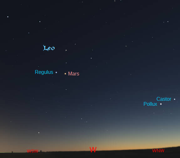 Mars and Regulus this evening near 10:30 PM, June 11, 2025. Created using Stellarium and LibreOffice Draw.