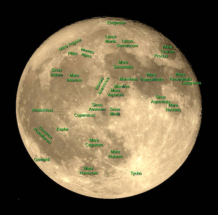 The Moon just 20 hours after being full, the sunset terminator is beginning to fill craters with shadows to the upper right of the Moon. Selected features are labeled. Created using Stellarium , labels from Virtual Moon Atlas, added using LibreOffice Draw and GIMP.