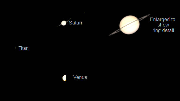 Telescopic Saturn and Venus (north up) as they would be seen in a small telescope with the same magnification. Mars is 5.2″ in diameter, too small to be shown here. My lower size limit is 10″. On the morning of the 12th, Saturn is 17.1″ in diameter, but its rings, being nearly edge on should show up brighter than seen here., and extend to 40.0″. They are tilted 3.4° from being edge on. Venus’ apparent diameter is 21.1″, and is 55.4% illuminated. The ” means seconds of arc, or 1/3600th of a degree. Created using Cartes du Ciel (Sky Charts), LibreOffice Draw and GIMP.