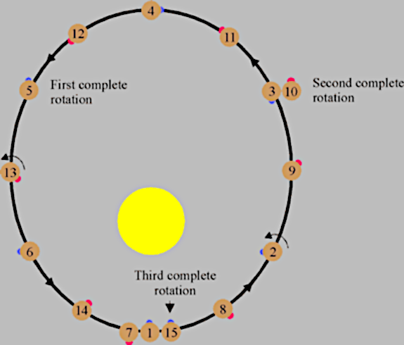 The planet Mercury is the closest planet to the Sun, and for a long time was thought to have synchronous rotation. That is it rotated in the same 88 days it took to orbit the Sun. However, in 1965 using radar from the Arecibo Observatory in Puerto Rico, astronomers learned that the rotation was exactly 2/3 of that 88 days. An interesting relationship of the sidereal rotation of 59 days against the stars, 2/3 of the Mercury’s year. Earth’s solar day, noon to noon is 3 minutes 56 seconds longer than the sidereal day. Mercury’s solar day turns out to be exactly 2 Mercurian years long.