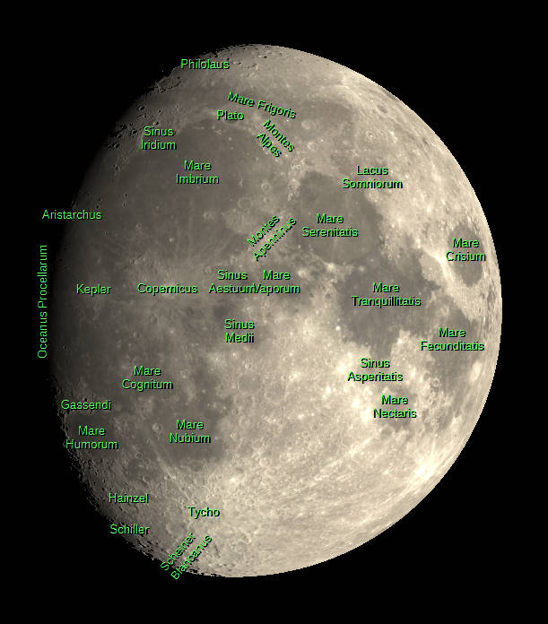 The Moon tonight, September 3, 2025. A view visible in small telescopes showing an image with and without selected features labeled. Created using Stellarium, LibreOffice Draw, and GIMP.