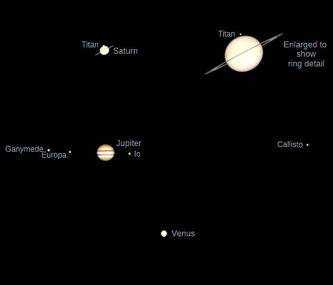 Telescopic Saturn, Jupiter and Venus (north up) as they would be seen in a small telescope with the same magnification. On the evening of the September 3rd 2025, Saturn will be 19.4″ in diameter, but its rings, even being nearly edge on, should show up brighter than seen here, and extend to 45.1″. They are tilted 2.5° from being edge on. On the morning of the September 4th 2025, Jupiter will be 35.0″ in diameter. Venus’ apparent diameter will be 12.1″, and be 85.2% illuminated. The (”) symbol means seconds of arc, or 1/3600th of a degree. Created using Cartes du Ciel (Sky Charts), LibreOffice Draw and GIMP.