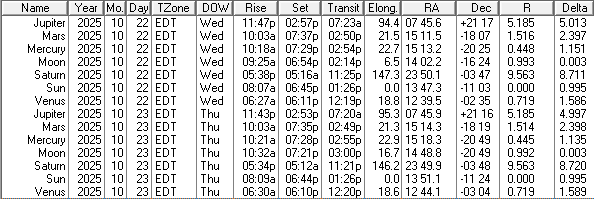 This is a low precision ephemeris of the Sun Moon and naked eye planet positions for today and tomorrow, October 22nd and 23rd, 2025. Some of the columns are self-explanatory, others are not. The transit column is the time that the body crosses the meridian and is due south. Elong, for elongation, is the angle between the Sun and that body. RA is right ascension, which is the object’s east-west position on the celestial sphere in hours and minutes. Dec is declination which is the north-south position of the object on the celestial sphere in degrees and minutes. R is the distance of that object from the Sun in astronomical units. An astronomical unit is about 93 million miles or 150 million kilometers. And Delta is the distance of that object from the Earth, also in astronomical units. I omit the ‘m’ in am and pm for compactness. The data was generated using my LookingUp for DOS app and displayed as a table by my Ephemeris Helper app.