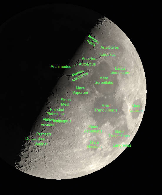 The first quarter Moon tonight, October 29, 2025. A view visible in small telescopes showing an image with and without selected features labeled. Created using Stellarium, LibreOffice Draw, and GIMP.