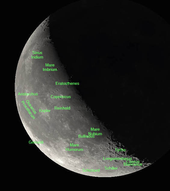The Moon a day past last quarter as seen before sunrise tomorrow, November 13, 2025. A view visible in small telescopes showing an image with and without selected features labeled. Created using Stellarium, LibreOffice Draw, and GIMP.