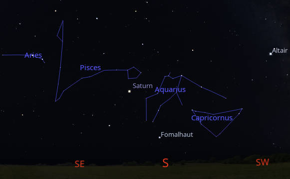 Saturn in the south southeast with the nearby zodiacal constellations at 8 PM tonight, November 12, 2025. Created using Stellarium.