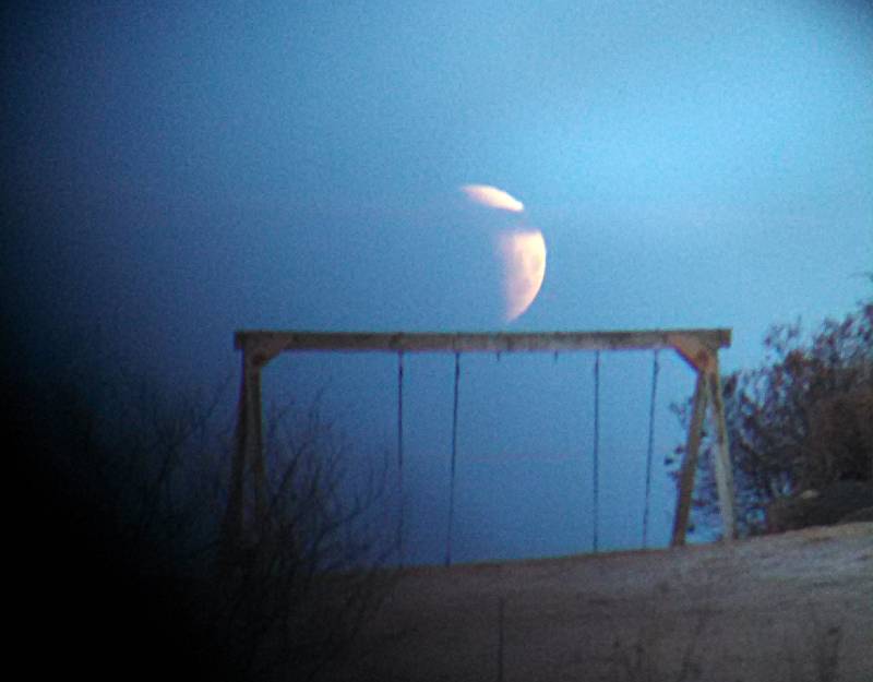 The end of the March 3rd eclipse will look something like this. The totally eclipsed Moon will disappear in twilight. Later the partially illuminated parts of the Moon will appear out of the blue before moonset.