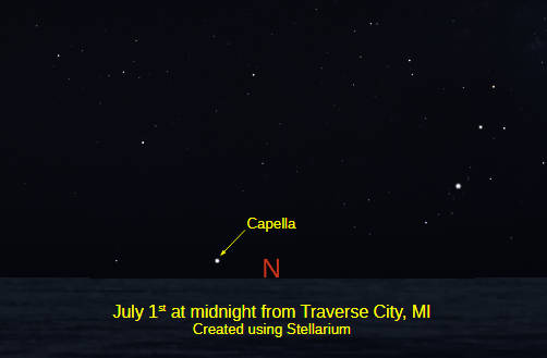 Capella is the northernmost first magnitude stars. Tonight it shines in the northeastern sky. First magnitude stars are the 21 brightest stars in the night sky. Capella is the 6th brightest. Although I’ve always known it as the little she-goat, Capella’s name literally translates to “little goat.” Her three Kids are represented by a narrow triangle of stars positioned to the right of her in tonight’s evening sky. Capella is in the topmost corner of the pentagonal constellation of Auriga the Charioteer. Capella is actually a system of four stars only 43 light years away. And never sets for listeners in the Interlochen Public Radio transmission area who have a low northern horizon.