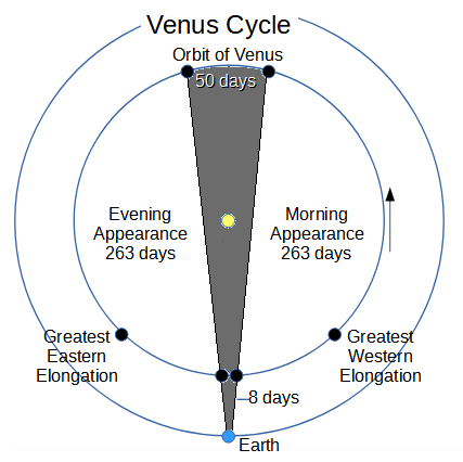 Tomorrow Venus will be in inferior conjunction with the Sun. That means that Venus will be moving between the Earth and the Sun, on its way from the evening sky to the morning sky. Venus’ orbit has an inclination to the Earth’s orbit of 3.4° and when we are closest to Venus as we are now only 26 million miles (42 million kilometers) away, that inclination gets exaggerated so that Venus is almost nine degrees north of the Sun. Venus gets about 8 million miles (13 million kilometers) closer to us than Mars ever gets. Of course when Mars gets that close it is fully illuminated. When Venus is at its closest we’re looking at its night side and couldn’t see anything even if we didn’t have the glare of the Sun.