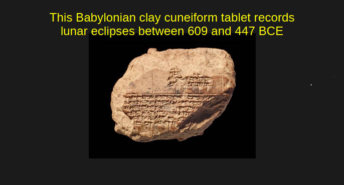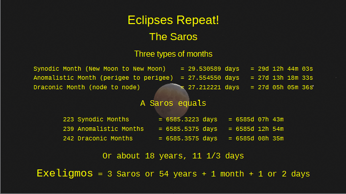 We know the Babylonians have been observing and recording eclipses since the 8th century BCE from their cuneiform tablets. By the 4th century BCE they had figured out that eclipses repeat themselves every 18 years and 11 and a third days. It seems they did this by observing lunar eclipses because that one third day in the saros. It keeps solar eclipses from being visible from the same location until 3 saros periods elapse that’s where we get the exeligmos where three saros periods equals 54 years and a month. With lunar eclipses if one sees a lunar eclipse in the early evening, one saros later, the next eclipse of the series will be visible in the morning before dawn.