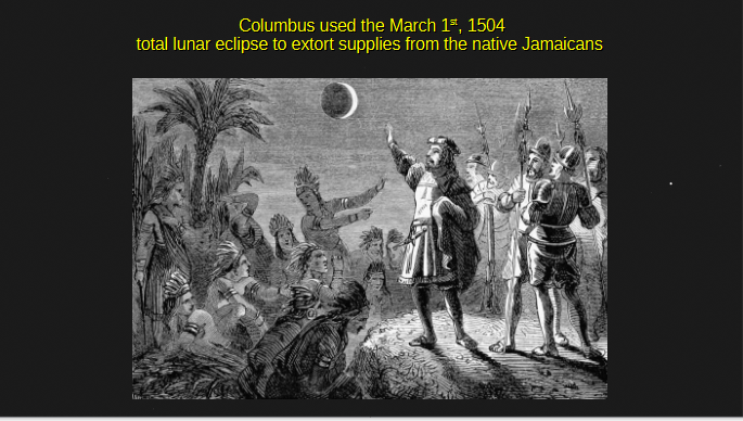 Columbus’ 4th voyage to the new world started out with four ships. After exploring the islands in I think the coast of South America, he ended up on Jamaica with no ships. At first, he had friend relations with the native Jamaicans, however over time that worsens when this crew began to harass, attack, and kill the native peoples, so they refused to give Columbus any more food or supplies. Columbus’s crew were on the brink of starvation when he checked an almanac and found out that soon there would be a total eclipse of the Moon. And on that fateful night he told the natives that unless he was given some supplies his God was going to take away the Moon. And that night the Moon did indeed begin to be devoured, that is the Moon began its entry into the Earth’s shadow. Columbus told them that unless they provided him with food and supplies his God was going to take away the Moon, and if they did provide him with supplies immediately he would consult with his God and see what he could do. The natives acquiesced and brought him food and supplies. Eventually within a couple of hours the Moon did indeed emerge from the earth’s shadow, and it was restored just as Columbus had said.
