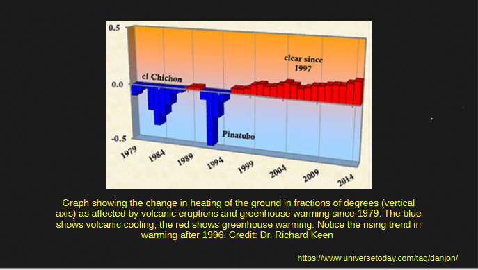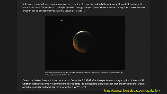 Above is a chart of the heating of the ground or lack of it caused by volcanic ash in the atmosphere in the 80s and 90s. We had two massive volcanic explosions the first El Chichon, in 1982, which I’ve already mentioned, and in 1991 Mount Pinatubo in Philippines, and how the volcanic ash caused cooling. It would also cause the dark lunar eclipses we saw. Since then even though this graph only goes to 2014 our lunar eclipses have been fairly bright, the red coloring obviously showing very well during totality.