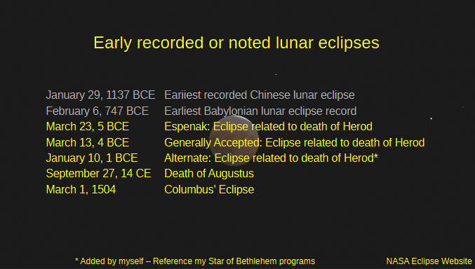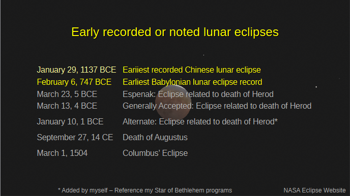 Continuing with our early recorded or noted lunar eclipses, we have 3 eclipses in 5, 4 and 1BCE, which are related to the death of King Herod the Great in Judea, around the time of the birth of Christ. In my biennial programs to the Grand Traverse Astronomical Society at Christmastime, where I discuss the Star of Bethlehem I referenced the latter two. They are also mentioned by David Hughes in his book The Star of Bethlehem. The first one is provided by Fred Espenak, recently retired from NASA, and now owns the website called MrEclipse.com. Most historians place the death of King Herod in 4 BCE, after the March 13th 4 BCE lunar eclipse. The source for this is the Jewish historian Josephus in his work Antiquities of the Jews. In it, he relates that King Herod died after a lunar eclipse but before Passover. The Jewish Calendar is a lunar calendar and Passover occurs at full moon, so the period during when Herod died is an integral number of lunar months before Passover. The 4 BCE eclipse occurs 1 lunar month before Passover. Josephus also records two chapters worth of palace intrigue of Herod’s court between the eclipse and Passover. To my mind and to many others, that is too short a period for all the events to have taken place, and the eclipse was partial visible early in the morning. The 1 BCE eclipse is total and allows 3 to 4 months for the palace intrigue to take place as Josephus describe it. I’ll get to Columbus’ eclipse in a bit, but first we’ll take a look at how eclipses can be predicted, which is the essence of the Columbus’ eclipse.