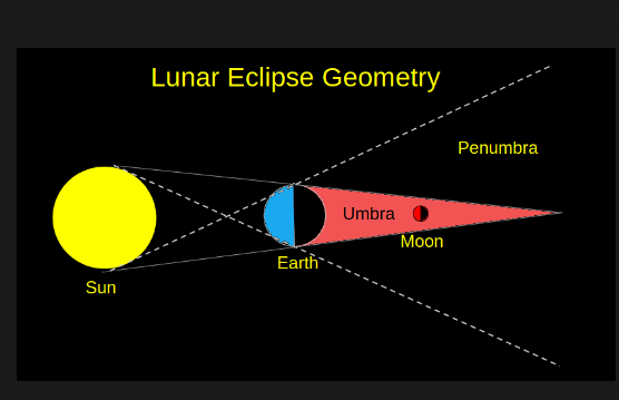 There are three types of lunar eclipses. The penumbral eclipse is when the Moon is too far north or south of the umbra and just enters the penumbra. A partial eclipse is where the moon again is too far and south but close enough to have part of it skirt the umbra. And total eclipse is when the Moon becomes completely immersed inside the earth’s umbral shadow.